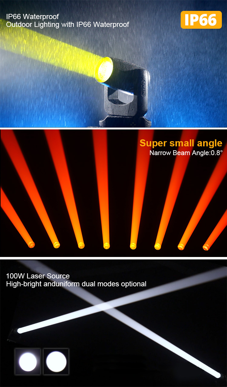 Dasen Imager is our brand of moving head.This series of products fully demonstrates our technological breakthroughs and product creativity in the lighting industry. We started from our original intention, providing solutions for users based on application scenes to let people can truly experience the value brought by lighting! Imager B100 is provided with a highly innovative colour section including patented eight colour wheel technology and most colourful prism effect. It offers a wide choice of 23+1 fixed gobos and 10+1 rotated gobos,IP rate is IP66 which increasing the possibilities for meeting any challenge in all conditions. This compact luminaire devised for stage and rental markets offers incredible creative potential.