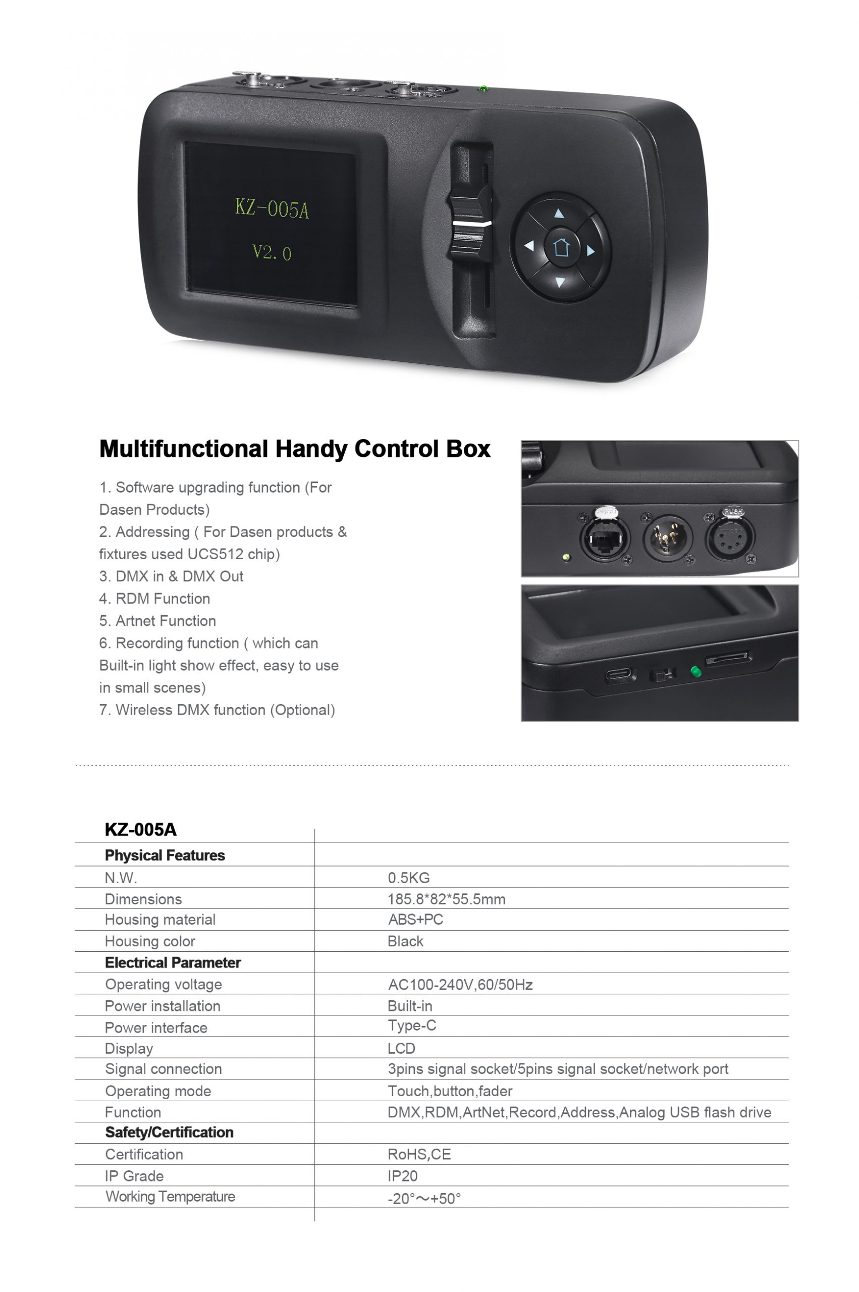 KZ-005A is a powerful DMX controller, it supports DMX512 as well as RDM; The controller easy operation interface for user, It can check and confirm the signal is normal or not,update the fixture software in different circuit online, It also can compile the lighting’s address code in bulk.