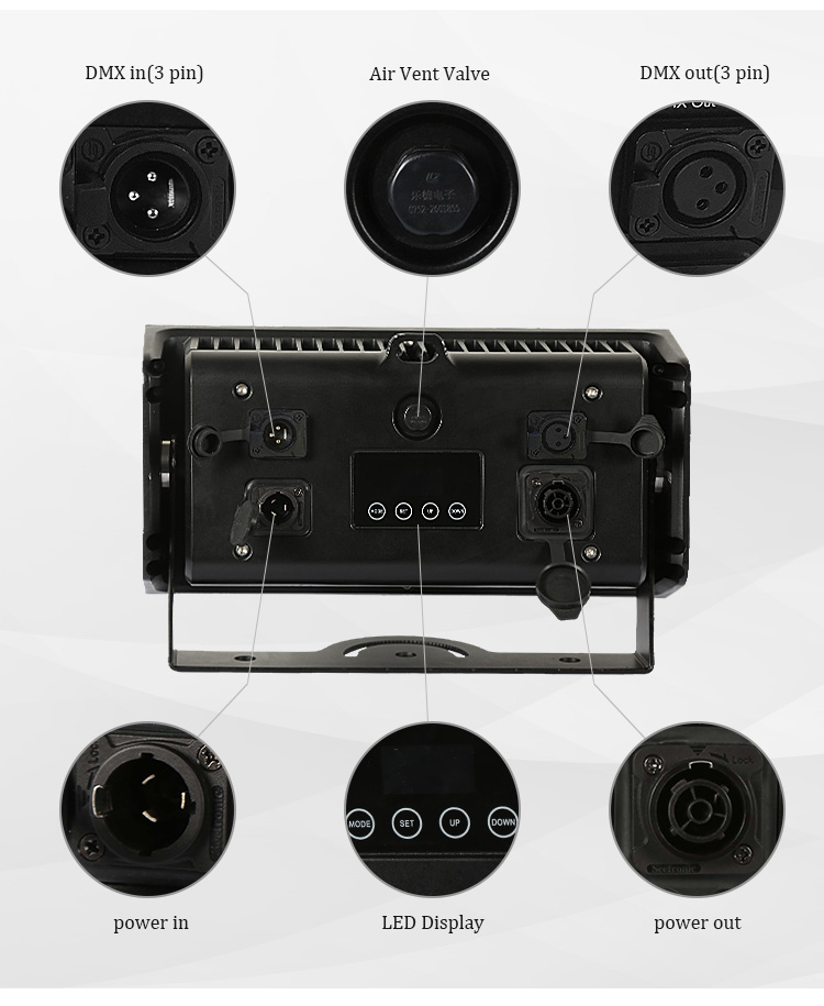 | Device Linking | DMX in/out(3 pin),power in/out | ||